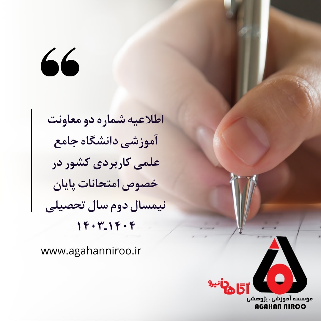 اطلاعیه شماره دو معاونت آموزشی دانشگاه جامع علمی کاربردی کشور در خصوص امتحانات پایان نیمسال دوم سال تحصیلی ۱۴۰۴ـ۱۴۰۳مشاهده